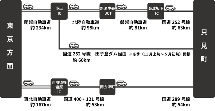 ・白河IC(東北自動車道)–R289(西郷村)→ R121(下郷町~南会津町)→ R289(南会津町~只見)